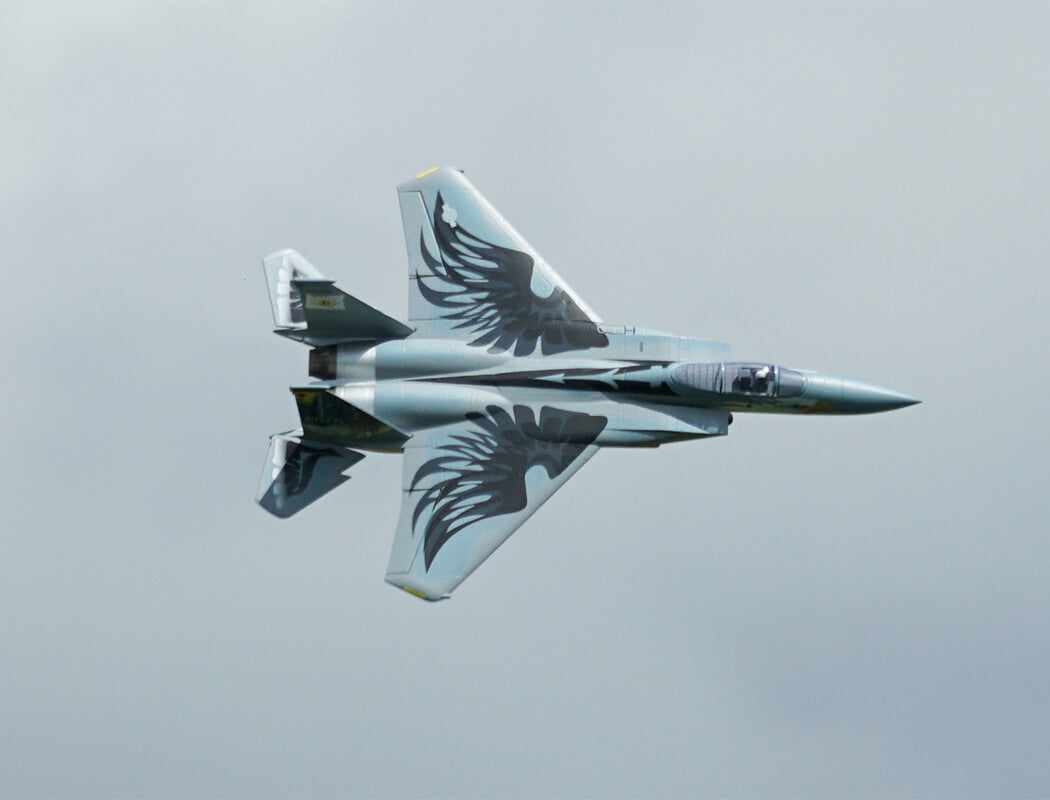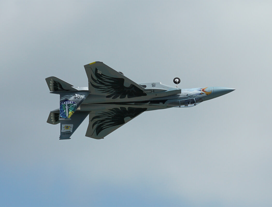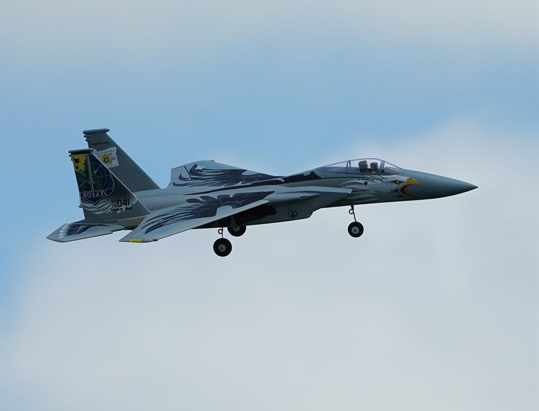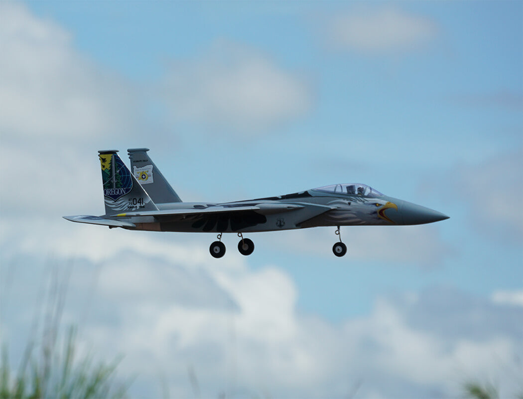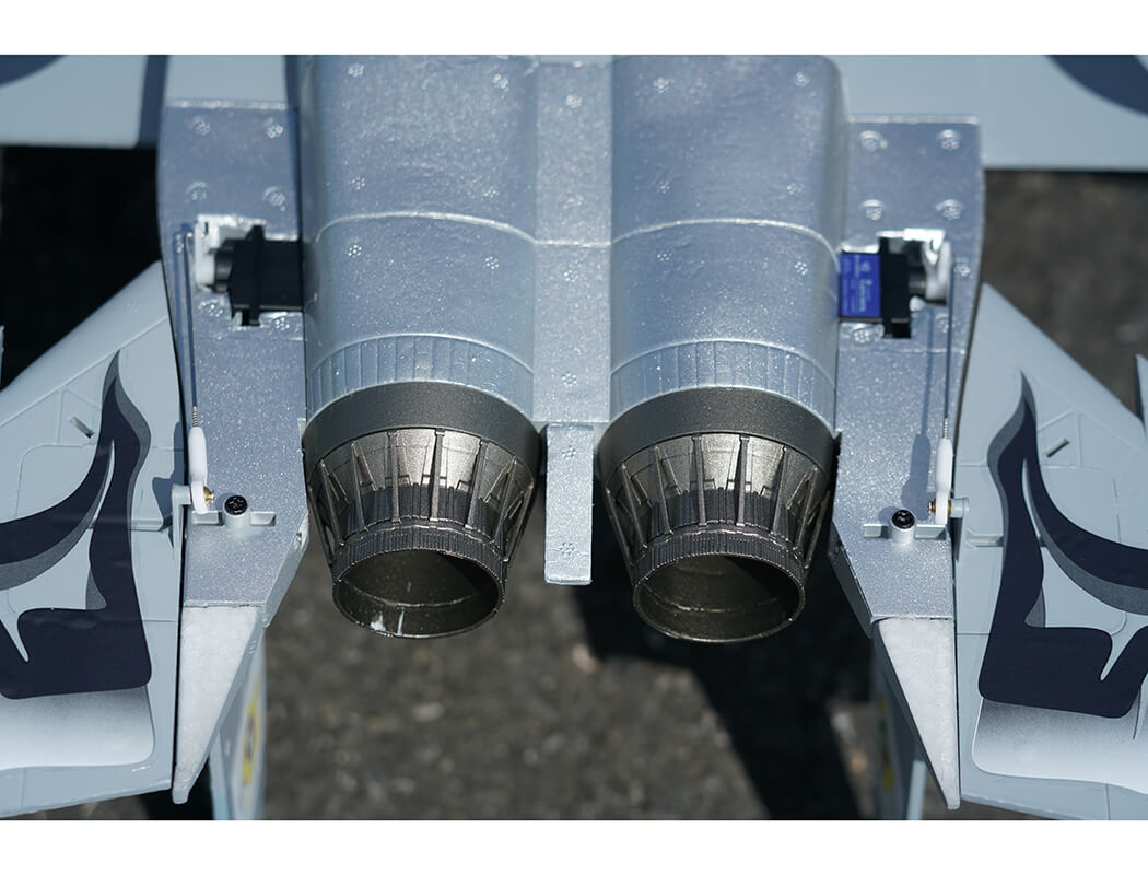 The factory-installed power system, including twin efficient 1413-KV5500 brushless motors and twin 20A brushless ESCs, paired with a 4S LiPo battery, delivers an abundance of thrust for fast climbs, rolls, loops and endless fun for high alpha flying due to the F-15’s low wing load and full flying stabs. A flight time of around 3-8 mins can be achieved with proper throttle management.