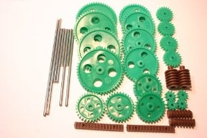 This is a 34 piece set of moulded plastic gear wheels 6mm wide with 3 mm bore worms and metal axles.
