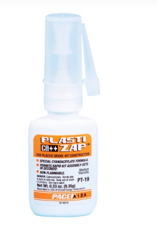Orange label. Medium viscosity for plastics. Cures clear. Won’t attack paint. Great on most plastic models, car moldings, and vinyl repairs.